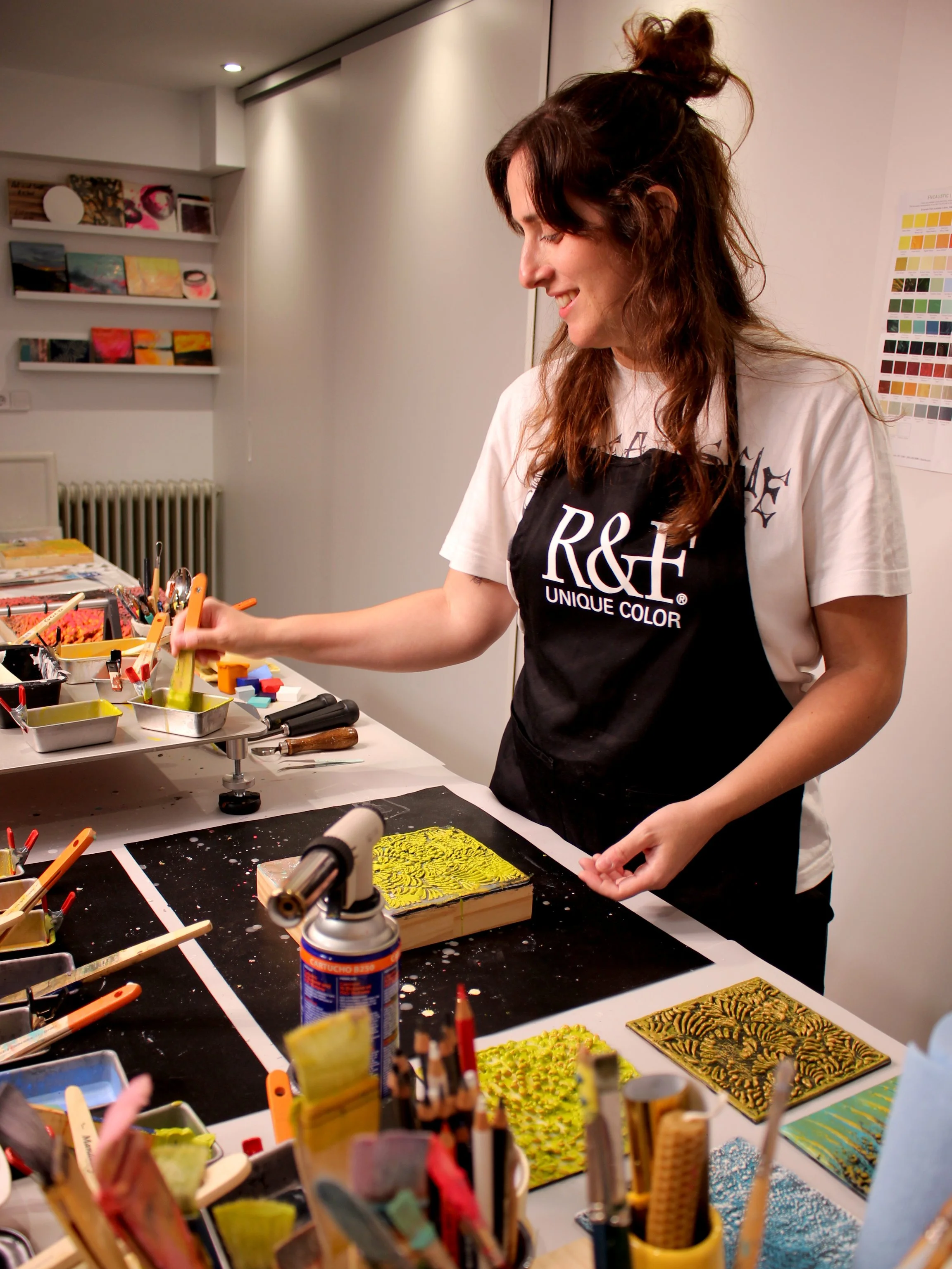 For the first layers, hold the brush vertically (that’s the trick!) at a 90º angle perpendicular to the panel, dragging in different directions until the brush no longer deposits wax. You’ll start to see the brushstrokes emerge, and with each layer, how the textures evolve.