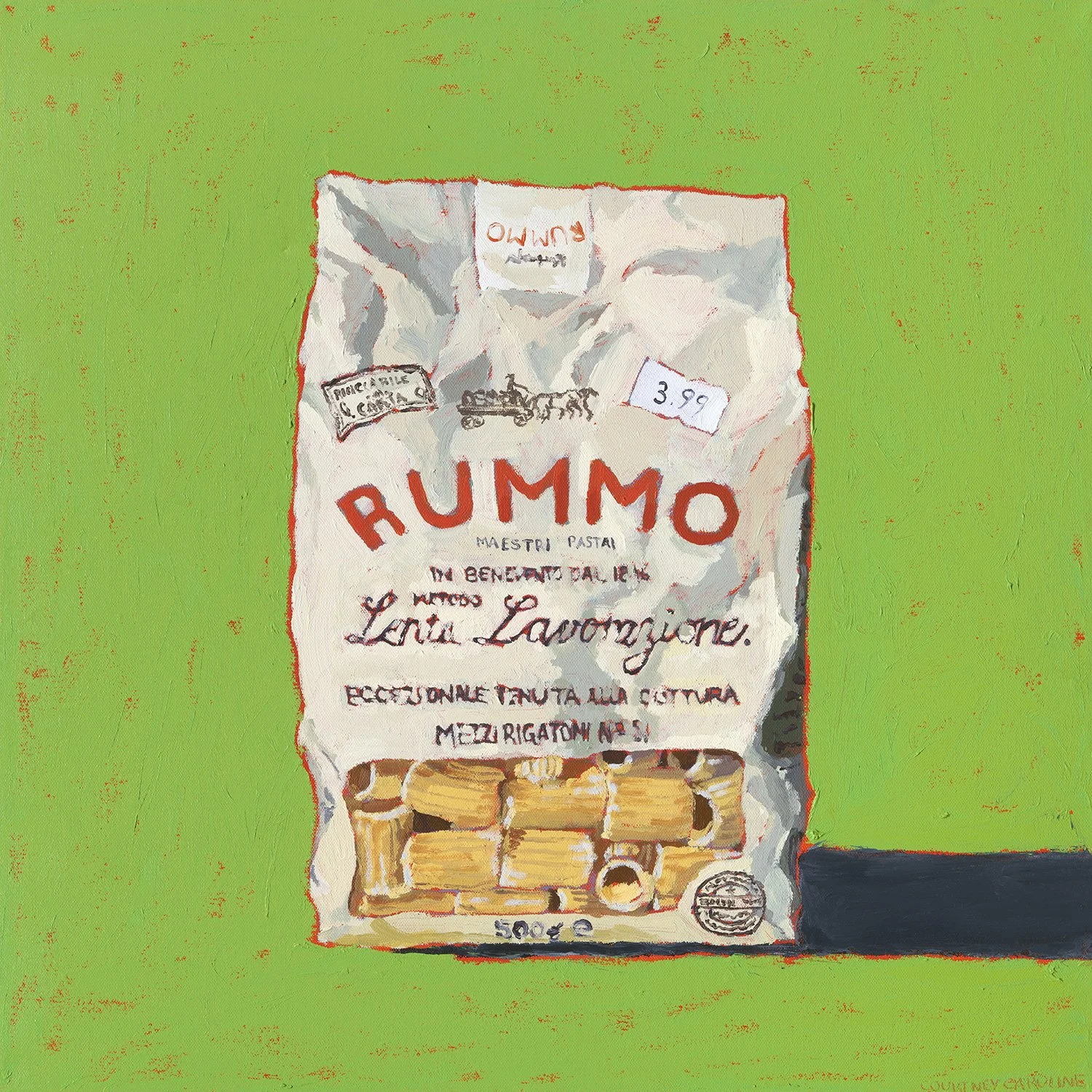 Courtney’s signature describes her as both “painter and foodie” and her work conveys a diversity of culinary experiences, featuring scenes from local restaurants, cafes, home-cooked meals, nostalgic food products, and iconic dishes from her travels. Her instagram feed is filled with juicy, close up shots of paint; scenes of her adding color and texture to paintings; and reels that would inspire anyone to pick up a paintbrush or an oil stick and dive in.